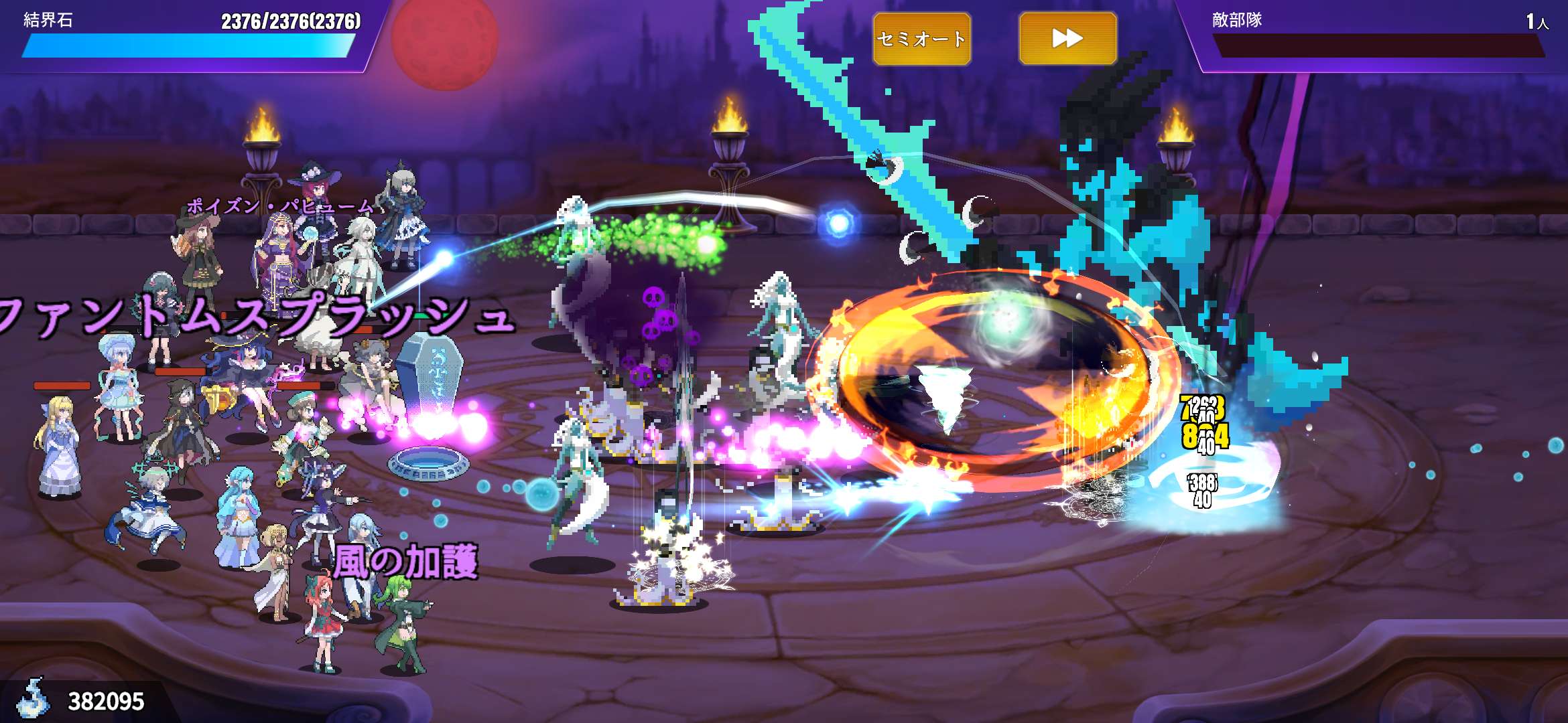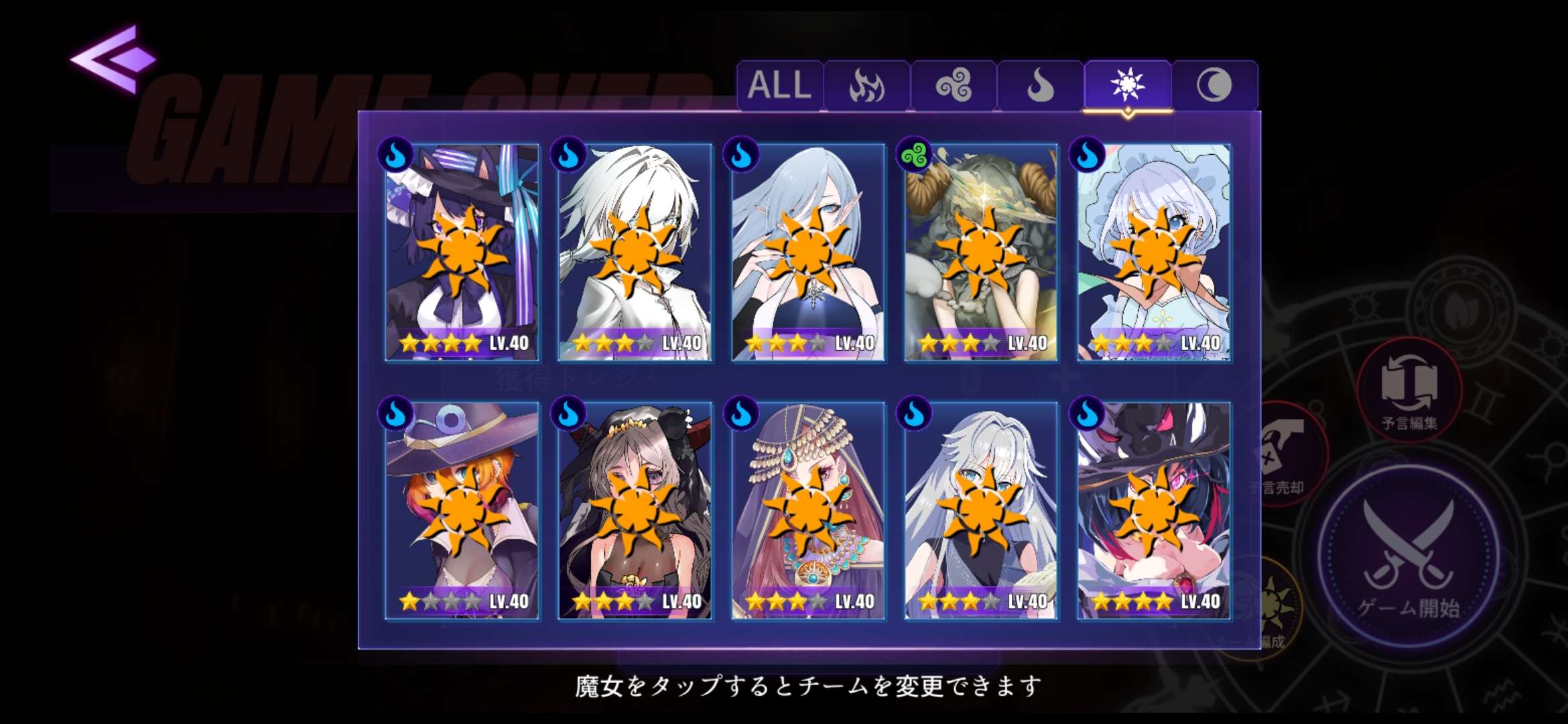 陽水隊,月風隊,因為風隊比水隊强,選角方面應該已經無可挑剔了,裝備繼承減幾件没什麼用的才能有足夠點數如圖帶上21個魔女(因為必須加插三隻火屬魔女才能完整隊伍),没帶的裝備開寶箱抽回來就好。