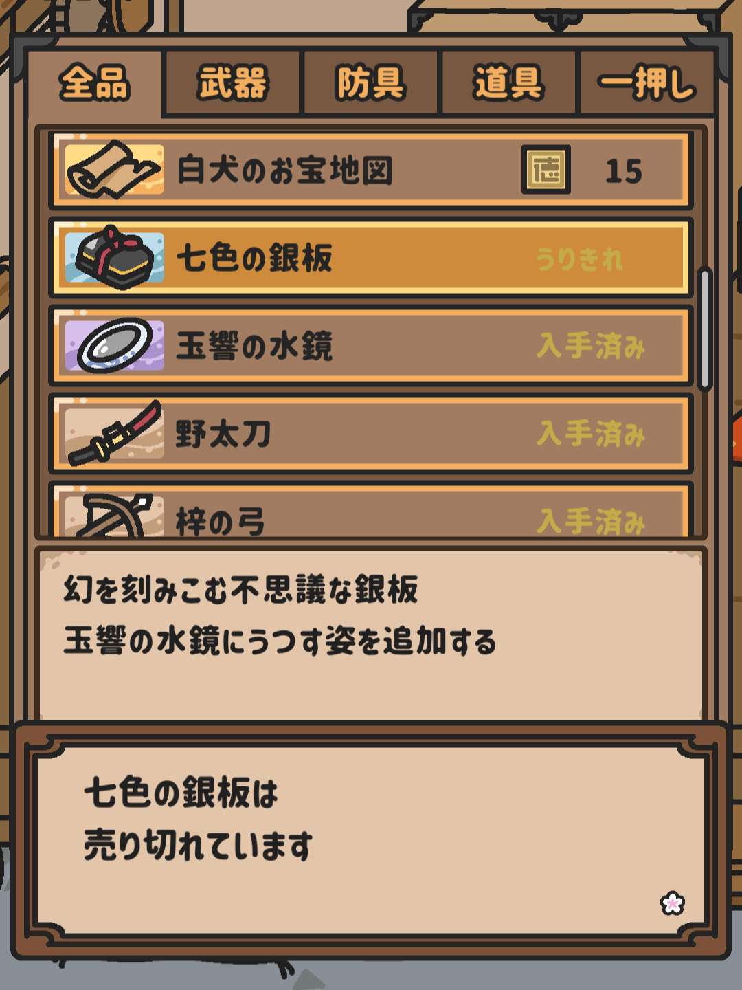 雪影눈_눈 2025-11-01 02:39 有没有人知道这个新动物是啥啊? 所有的物品都摆过了就是不来,剪影像个马头?试了胡萝卜也没来,真的服了 閲讀正文 彩笔bot 2024-07-30 08:15 奸商啊 白犬这个宝藏地图不建议买,15德换了1090的钱 閲讀正文 彩笔bot 2023-12-28 14:54 买了镜子和银板,可以给狗狗换毛色了 镜子40德,银板30个打完大河童后给的票,银板好像只能用两次,不能重复买,不过黄狗和白狗新毛色怪丑的,还不如不换 閲讀正文 壶 2023-12-07 03:16 关于朱雀 带上一狗和四狗,装备带一个耐火的,其他按需,御守我带了月轮 小怪和普通形态朱雀不要紧,攒满火和hp就行 然后就是掌握它的进攻规律,先有一个不攻击的前摇,接着提示进入下一个阶段(也不攻击),再两次攻击(第一次强第二次弱),如此循环,一共5阶段 1,2阶段建议攻击时防守,不攻击的时候回个血或者火,总之3阶段前最好满血满火 3阶段后回复力减少,能不回就尽量不回,防守为主 4阶段第一次攻击3火挡,第二次2火或以上 5阶段只有一次大招,用3火挡,然后就会大幅削弱,回个血就过了 閲讀正文 彩笔bot 2023-11-17 14:31 目前来做客小动物们所需要的道具 下一頁 載入中