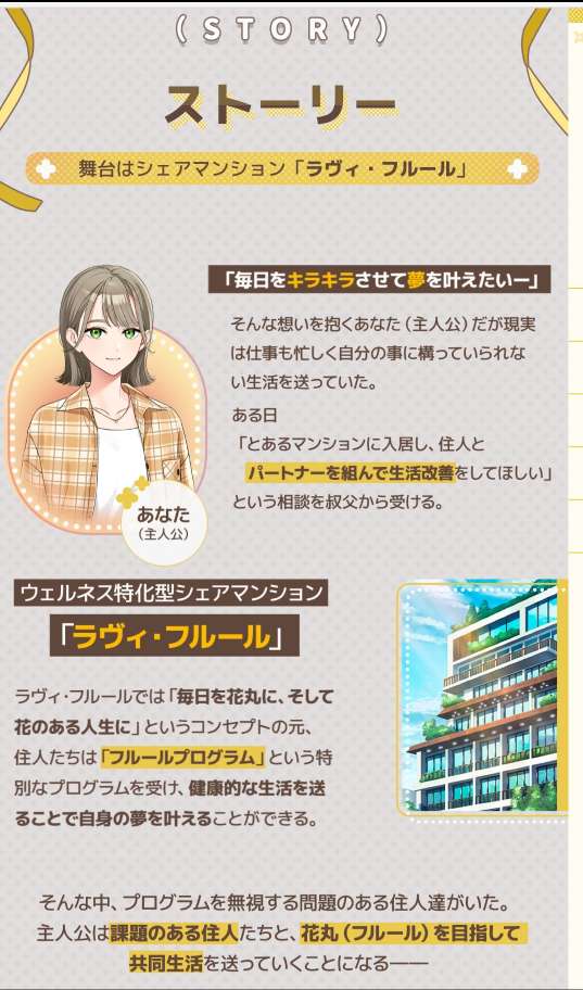 The protagonist ends up living together with these troubled residents, aiming for 'Hanamaru (Fleur)', a perfect score through shared daily life…