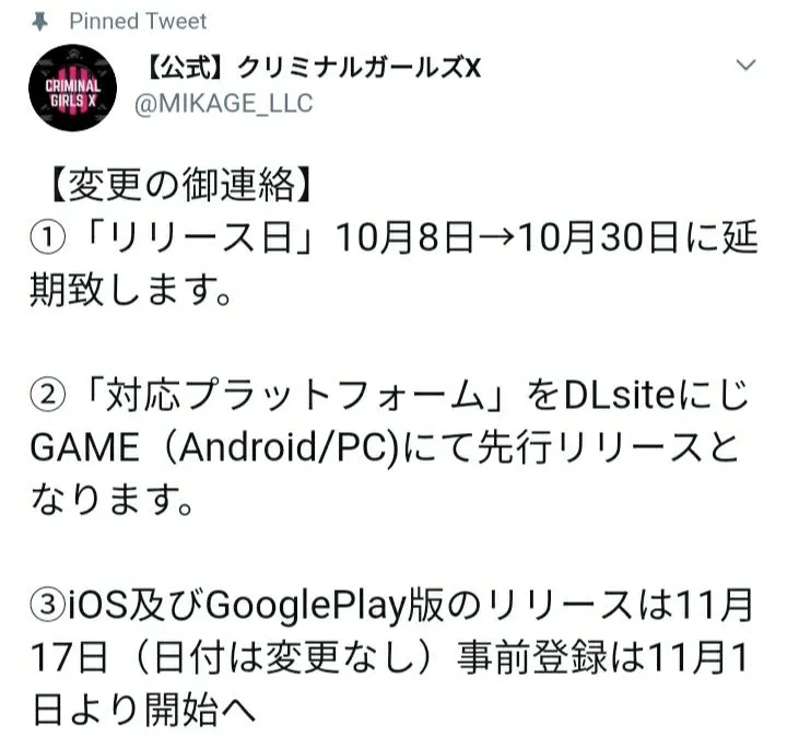 The release date for Criminal Girls X is moved to October 30th, they did say that this game will be released in advance via DLsite if you're device supports it, this applies to Android and PC. The IOS and Google Play version will be released on November 17th, pre-registration starts on November 1st.