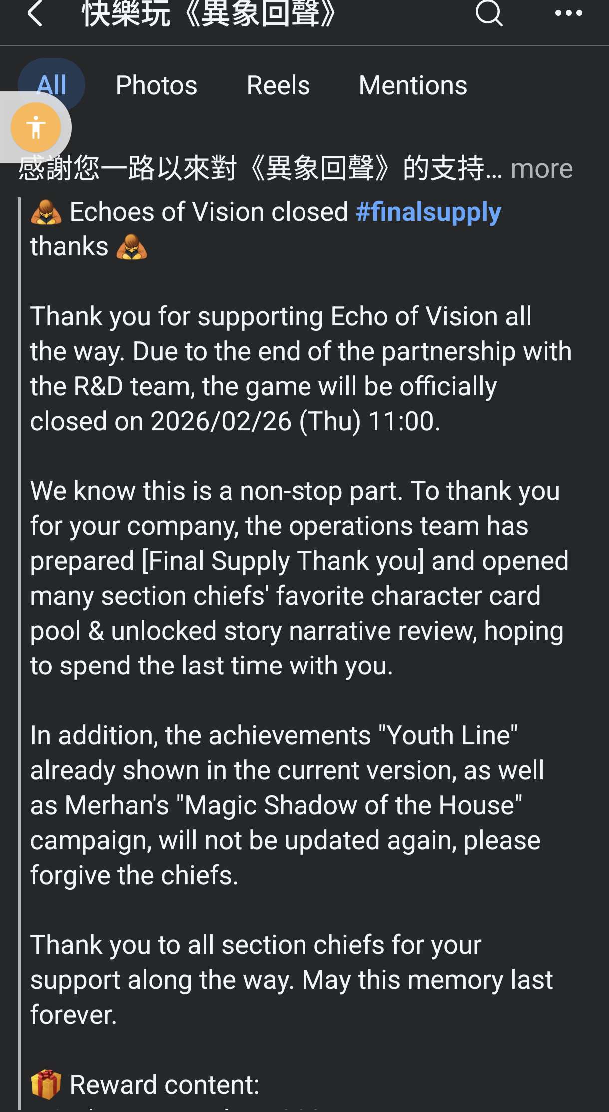 The game has closed down at 26 February 2026