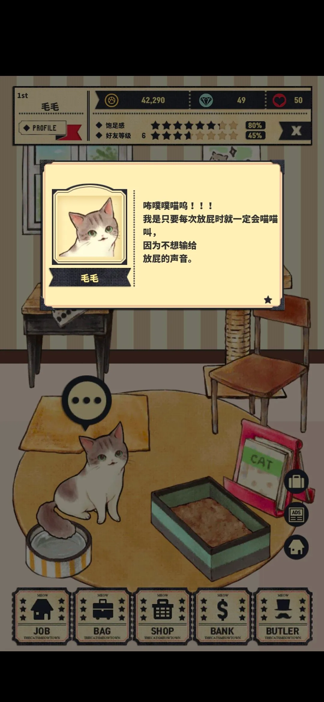 고양이자리 - 고양이 키우기 게임카드 玄上牧马 Game Hunter The cat's meow town 2020-04-15 05:46:25 게임명함을 추가하고 1장의 스크린샷을 공개하였습니다. 캐릭터 이름: (= ̄ω ̄=) 소개: 骚话连篇,一脸萌逼orz