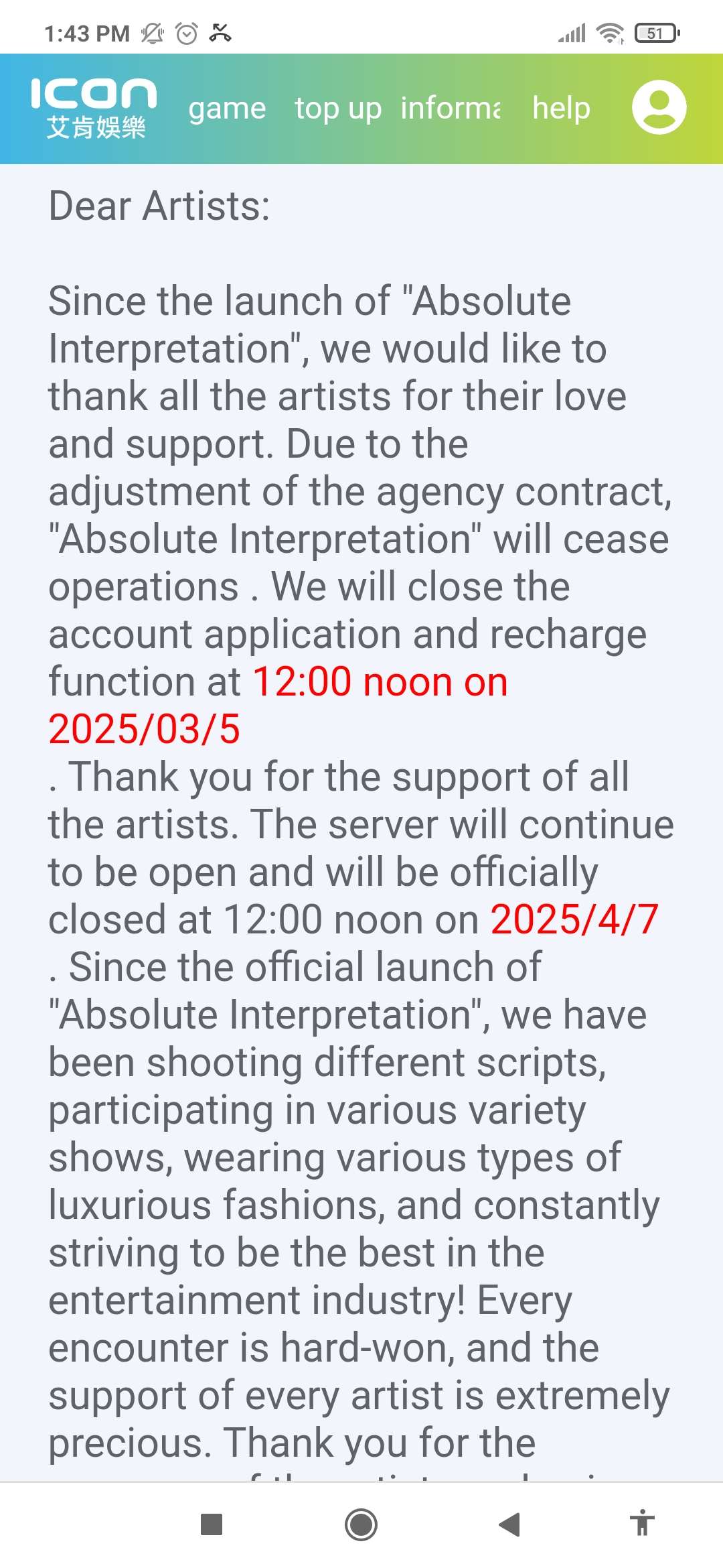 I have played game from ican before but it closed and thats my fav game. I feel scared playing in this dev now but I kinda interesting with this game, but if its very little player play this game, then maybe I didn't play it.