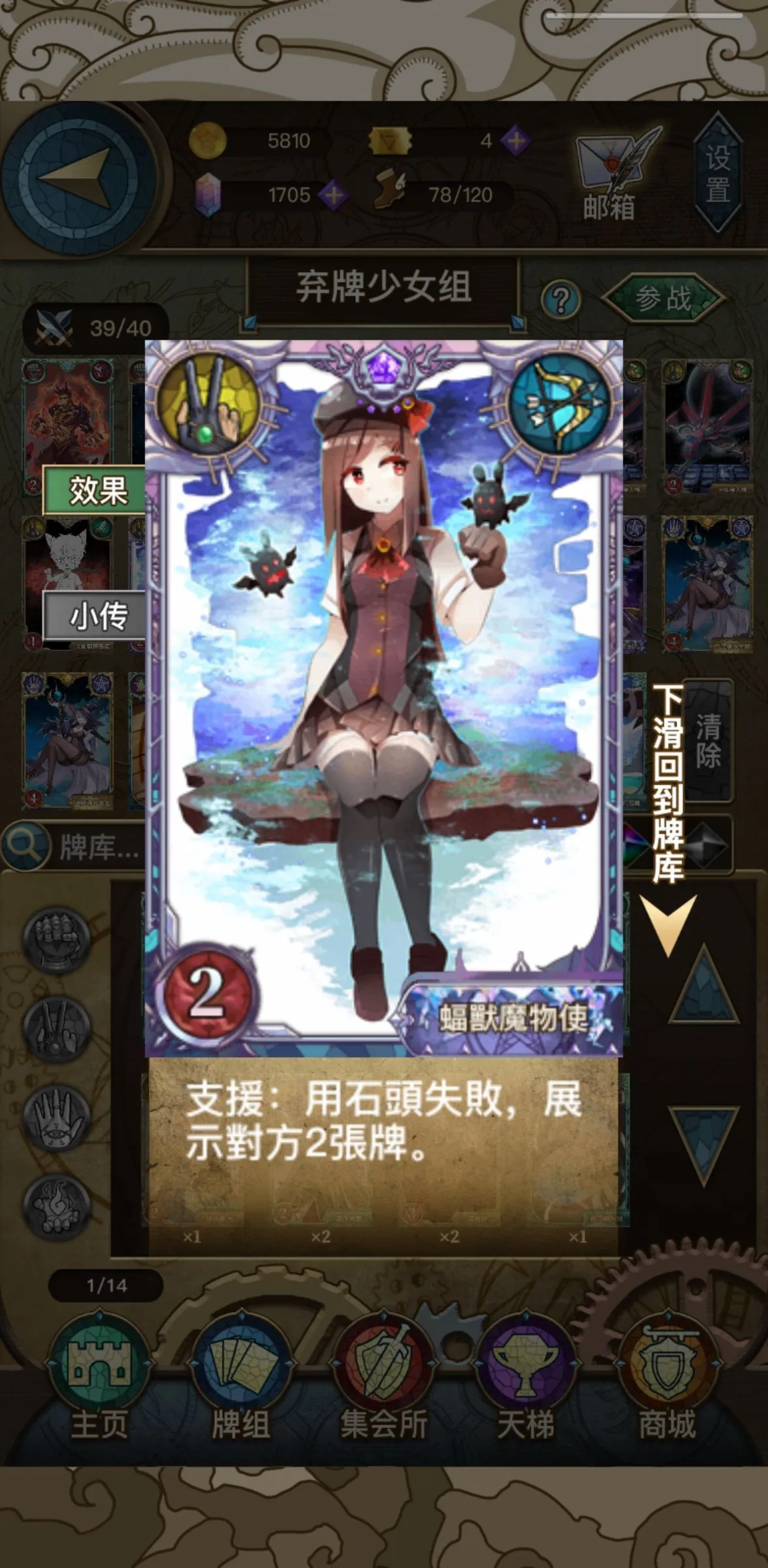 猜拳骑士传说 Cards 无恙 猜拳骑士传说 2022-04-17 18:23:45 Game Card created, 1 cards shared Player Name: Decade Introduction: 交流群欢迎新手大佬 进群 [17|16|嗨]卷 猜拳骑士传说 2022-04-06 17:12:43 Game Card created, 1 cards shared Player Name: 火力少年王 Introduction: bug反馈!支援 无效果... 龍灣沈公子 猜拳骑士传说 2022-03-18 11:31:50 Game Card created, 1 cards shared Player Name: 阿斬 愛里沙 Introduction: 牌組簡介: 這套時空團玩法就是前期苟活,積累能力全開效果:棄牌區3張不同時空團!注意點在于每回合觸發牌的效果不同,要算好回合下牌!角色選莉娜,因爲莉娜大技能之後會變身,變身後在用能力全開效果觸發技能對面手牌就全部沒有了!這樣你的勝率就會大大提升! 戰華無雙 猜拳骑士传说 2022-03-18 09:48:55 Game Card created, 1 cards shared Player Name: 阿斬 Introduction: 未知系列:核心卡牌未知少女,通過無人機和自走炮將未知少女反複加入,使手牌總是保持一個良性的狀態,天使座和人馬座增加過場能力,要塞不是很必要,可以替換成其他牌,其他隨意,我這個牌組算是比較順暢的。 優點:基本都是普通優等牌,應該說是很容易湊齊的了。